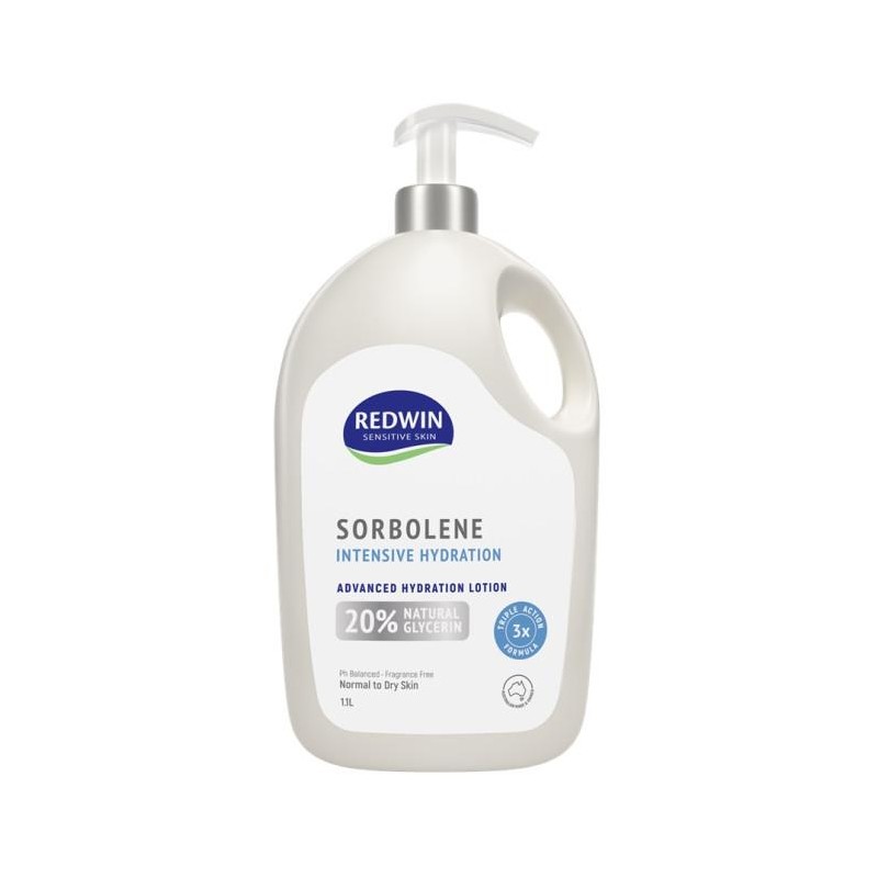 Redwin Sorbolene Intensive Hydration Lotion uses Redwin’s same reliable Sorbolene, plus 20% Natural Glycerin to provide advanced hydration power in a convenient 1.1L family pump format.