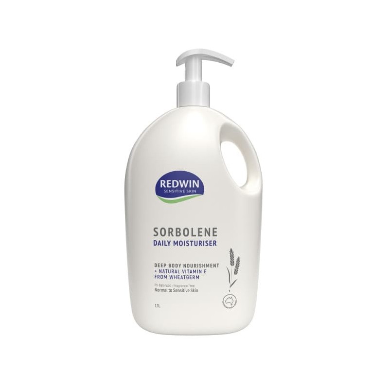 Redwin Sorbolene Daily Body Moisturiser enriched with natural Vitamin E from Wheatgerm for deep body nourishment for normal to sensitive skin in a convenient 1.1L family pump format.