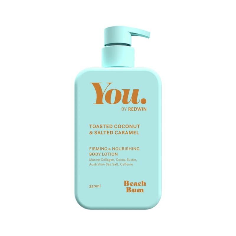 "YOU By Redwin Beach Bum Body Lotion formulated with Marine Collagen, Coco butter, Australian Sea Salt & Caffeine to firm and nourish skin. Beautifully scented with toasted coconut and salted caramel.