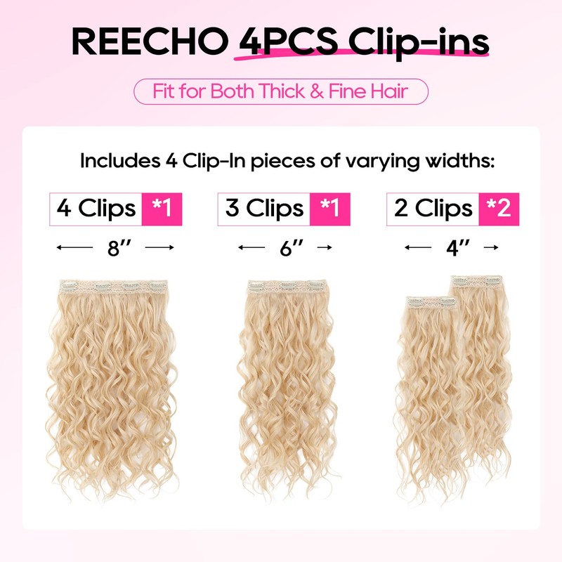 - [Natural Beautiful Curly Hair] Create a luxury curly hair look with REECHO 4PCS clip-in hair extensions. Designed with seamless wefts that lay flat on your scalp, offering an undetectable, flawless finish. The natural waves blend effortlessly with your own hair, giving you a seamless beautiful curly appearance
