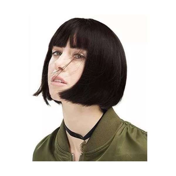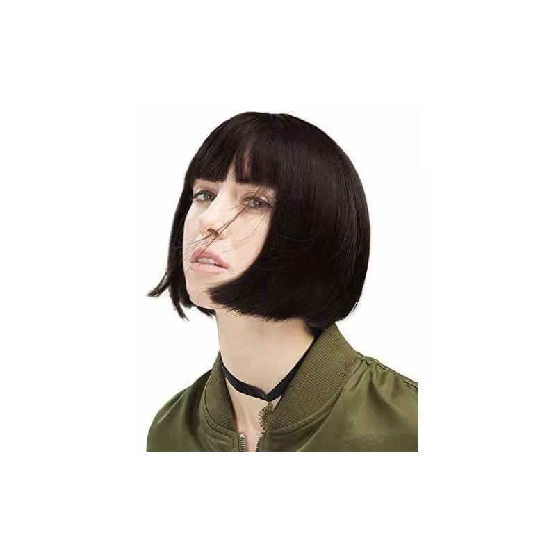 Es una peluca corta y recta de color marrón negro con flequillo, buena para cosplay, disfraces, e incluso para el uso diario.