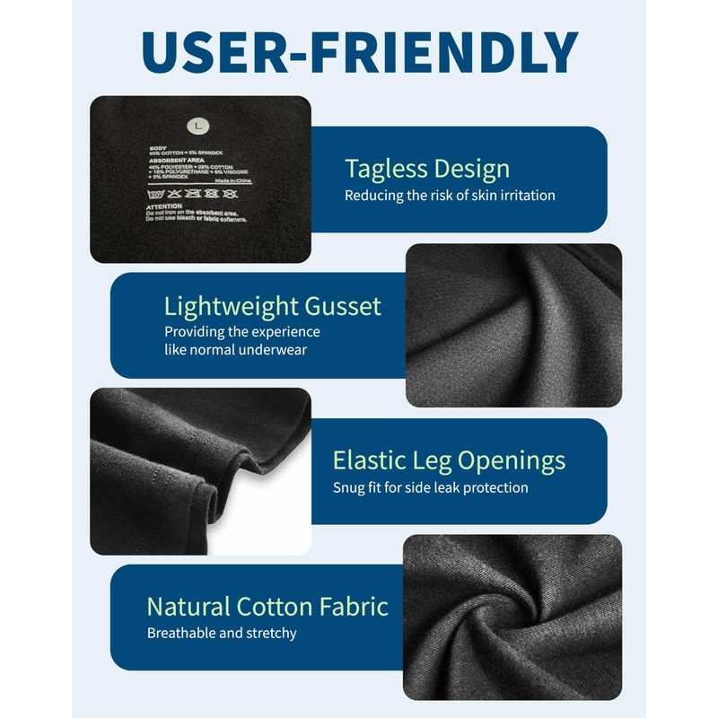 - Leak-Resistant Design: Designed with secure elastic leg openings and a leak proof gusset, these mens leak proof briefs help prevent side leaks. These features work together to offer reliable coverage and peace of mind throughout the day