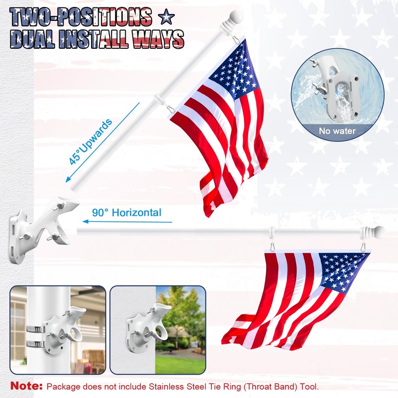 - 【2-Positions & 3 Fixed Holes & Dual Installing Ways Flagpole Bracket】The 1" flagpole mounting bracket, allow the flag to be displayed at 45° or 90°, can be mounted on wall or post by dual installing ways. 3-fixed hole butterfly screws make the flagpole more secure in all weather conditions. Made of thickened premium aluminum, precision polishing process, with waterproof & anti-rust coating protection, stable durable, long-lasting. Equipped with 5 steel screws & 5 anchors & 4 butterfly screws.
