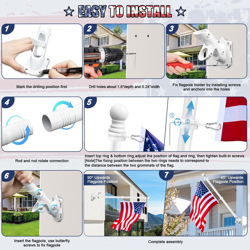 - 【2-Positions & 3 Fixed Holes & Dual Installing Ways Flagpole Bracket】The 1" flagpole mounting bracket, allow the flag to be displayed at 45° or 90°, can be mounted on wall or post by dual installing ways. 3-fixed hole butterfly screws make the flagpole more secure in all weather conditions. Made of thickened premium aluminum, precision polishing process, with waterproof & anti-rust coating protection, stable durable, long-lasting. Equipped with 5 steel screws & 5 anchors & 4 butterfly screws.