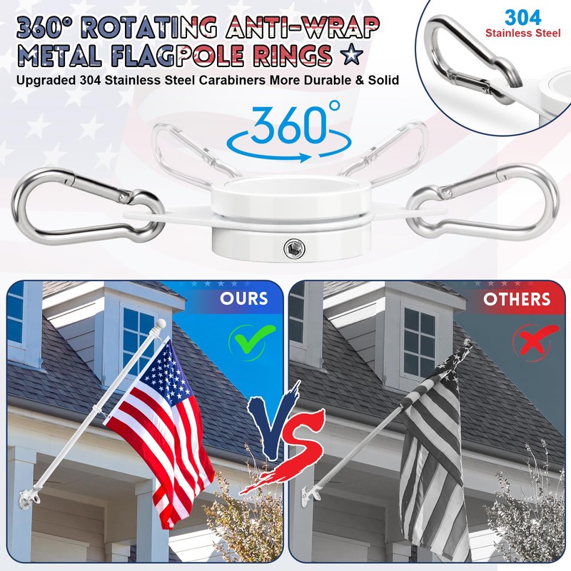 - 【360° Rotating Silver Metal Flagpole Rings with Upgraded Carabiners】Aluminum Alloy Flagpole Rings with unique improved anti-wrap high-strength steel swivel ring, rotating super smooth & durable, no rust, not easy to bend or break, effectively reduce tangling issue, withstand harsh weather elements. Inner diameter is 1.02", adjustable by built-in screw and allen wrench. 2 pcs upgraded 304 stainless steel flag carabiner clips, super strong, perfect connectors for flag pole and flag with grommets.
