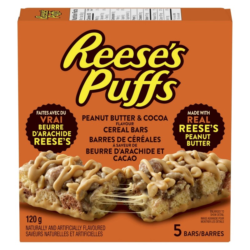 Reese's Puffs Peanut Butter & Cocoa Cereal Bars are made with real Reese's peanut butter, cocoa and whole grain brown rice. Each package contains 5 cereal bars, offers an ideal, quick snack choice!