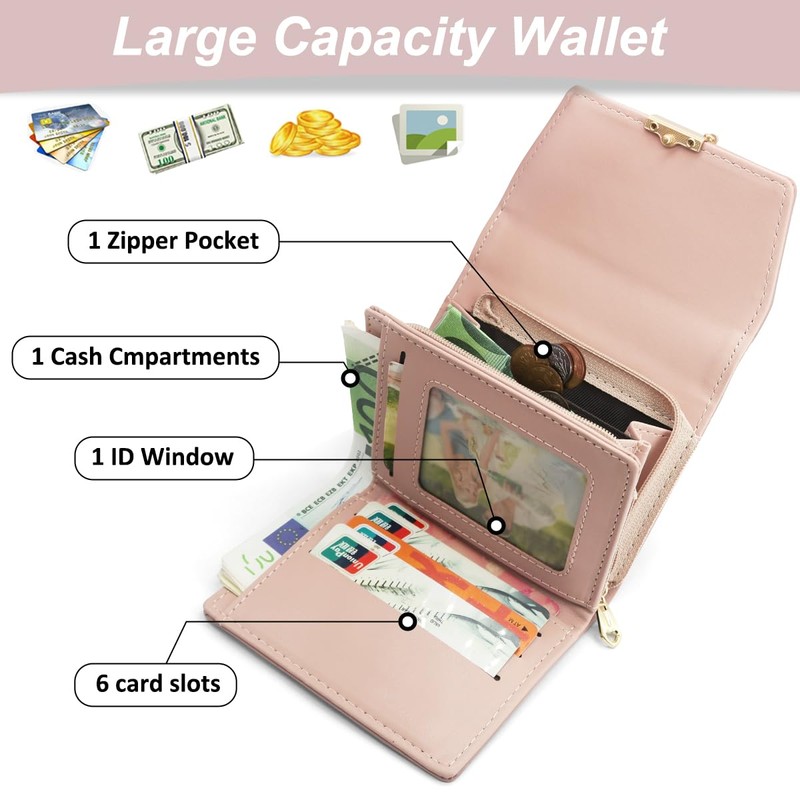 - Small but spacious: this women's small wallet has 5 card slots, 1 photo window, 1 coin pocket with zip, a main pocket for the bill. It has plenty of space for cards and cash, so everything important is always with you.
