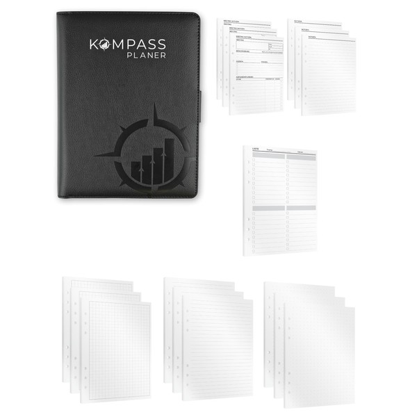 Start now with the KOMPASS DIN A5 ring binder starter set. In addition to the high-quality ring binder planner and index pages, the set also includes the most important refill pages for an optimal start. So you can start planning your goals, your week and your everyday life immediately.