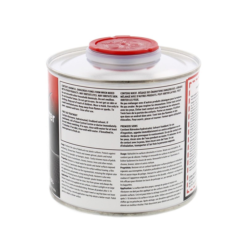 A liquid sealer for plastic and metals surfaces that have been exposed to weather. Restore Refinisher penetrates deeply into the surface without leaving a film or risk of peeling. Drives out the engrained dirt, restoring the original color and appearance, and provides a long-lasting finish. Also very effective at removing traces of polish from plastic fenders and trim. Warning: This product can expose you to chemicals which is [are] known to the State of California to cause cancer and birth defects or other reproductive harm.