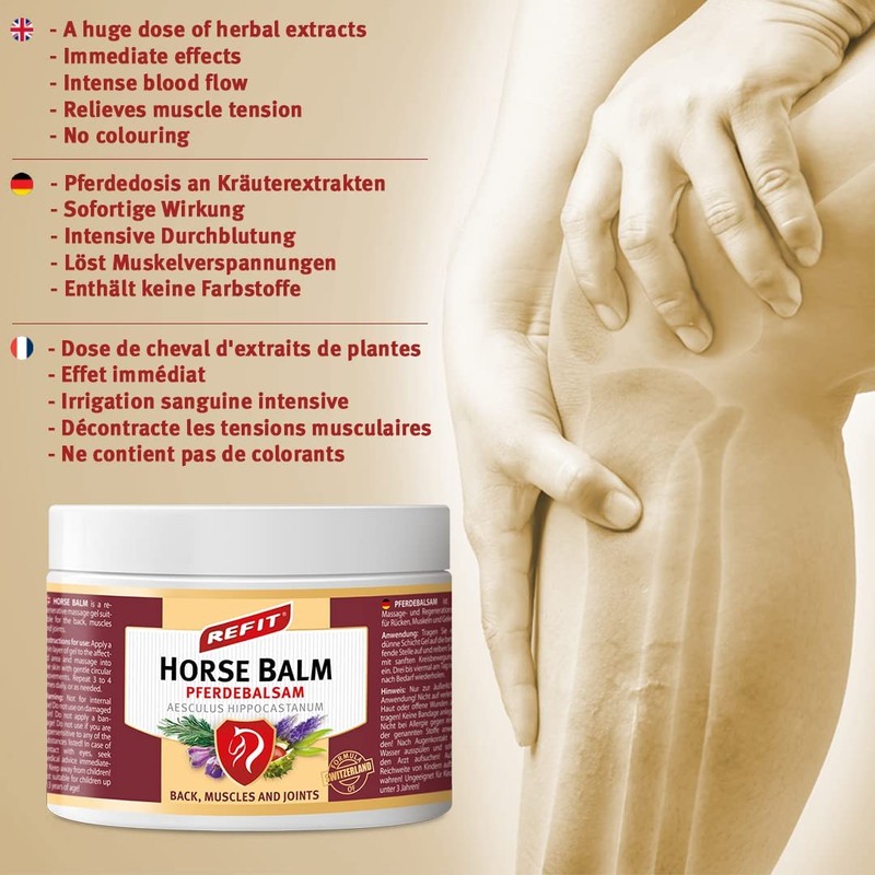 - Rich in natural extracts: REFIT horse balm is rich in effective herbal extracts and owes its unique properties to an advanced Swiss formula. After months of testing and fine tuning, a perfectly balanced blend of peat and herbs has been developed.