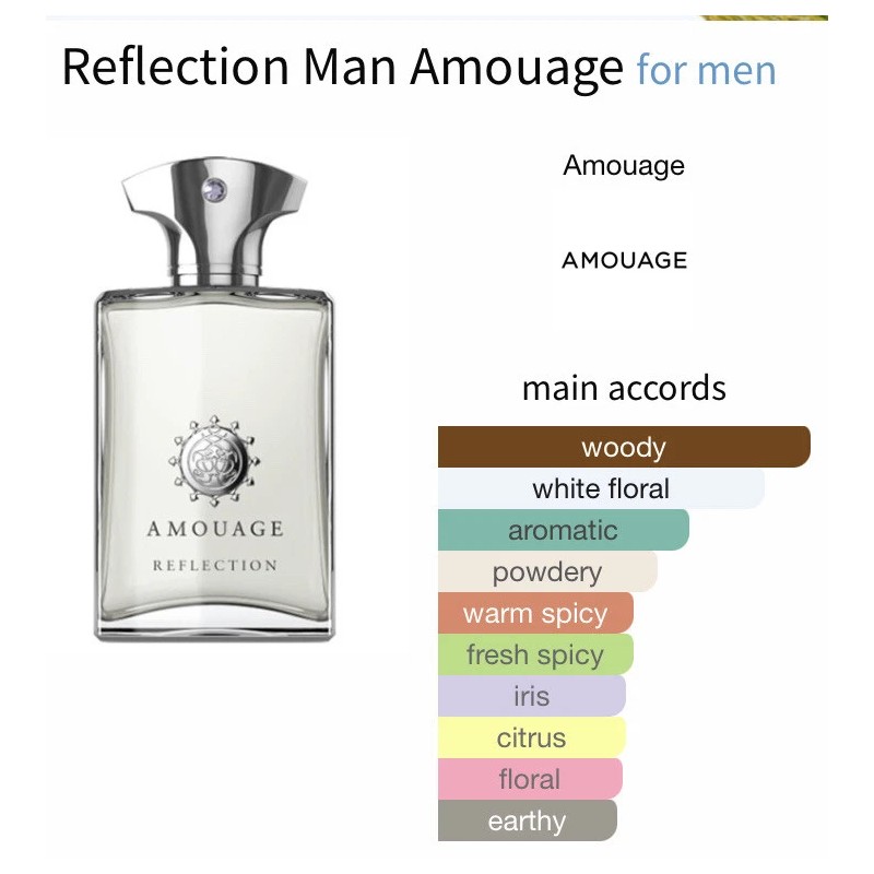 Reflection Man by Amouage is a Woody Floral Musk fragrance for men. Top notes are Rosemary, Pink Pepper and Petitgrain; middle notes are Jasmine, Neroli, Orris Root and Ylang-Ylang; base notes are Sandalwood, Vetiver, Cedar and Patchouli.