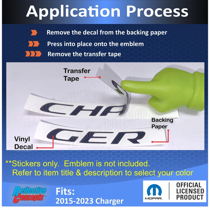 - Includes 2 CHARGER decal stickers [1 plus an extra]. Split into two sections: CHAR and GER for ease of application