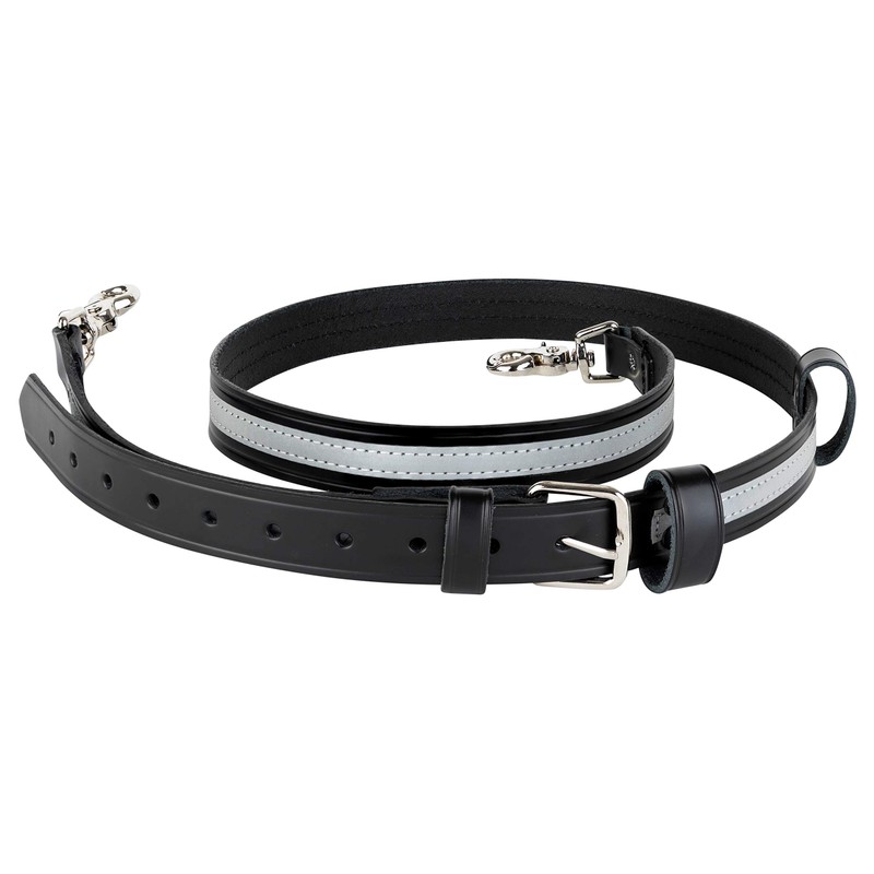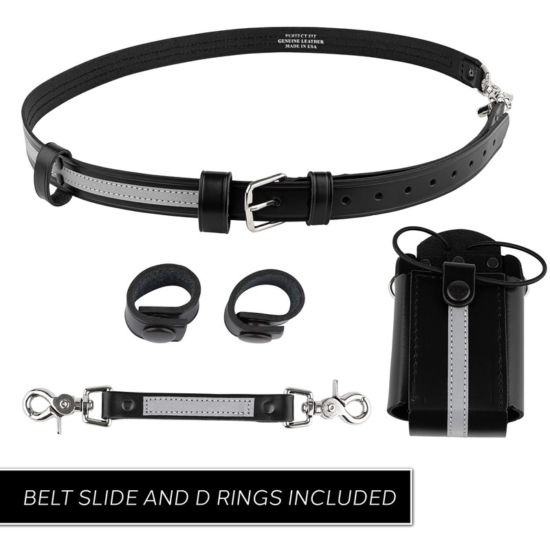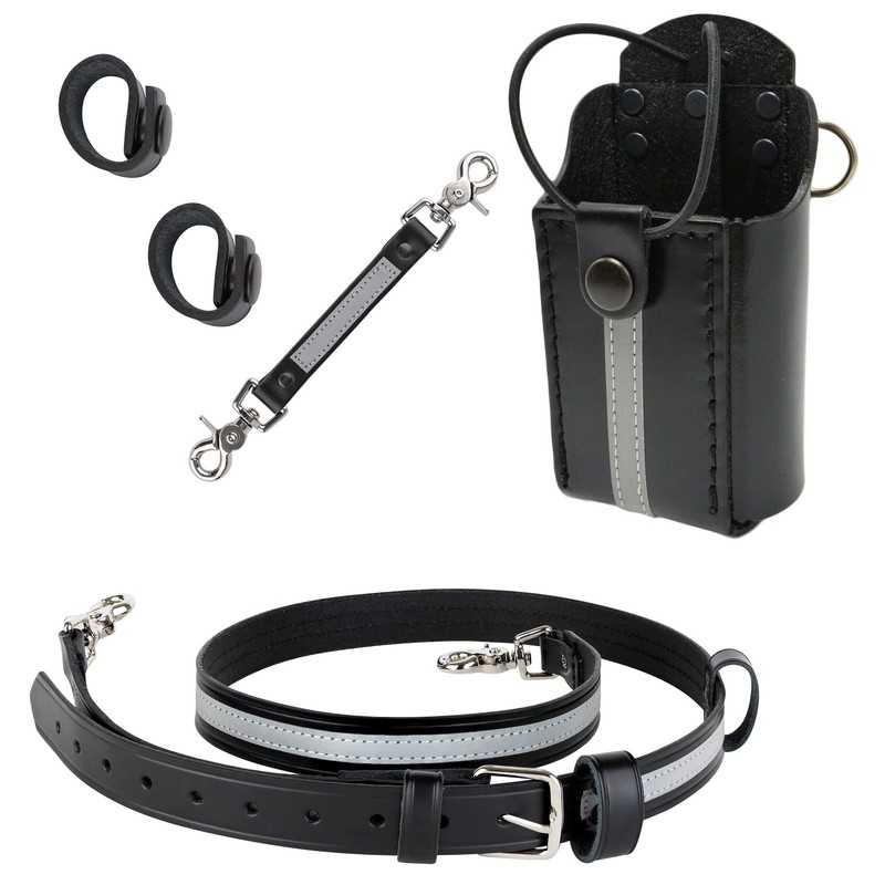 The Perfect Fit Universal Leather Reflective Fire Radio bundle is made by Perfect Fit Shield Wallets in Corinna, ME. It includes a universal radio holder, anti-sway strap, radio strap and two cord keepers. There is 3M reflective material on the radio holder, anti sway strap and radio strap.
