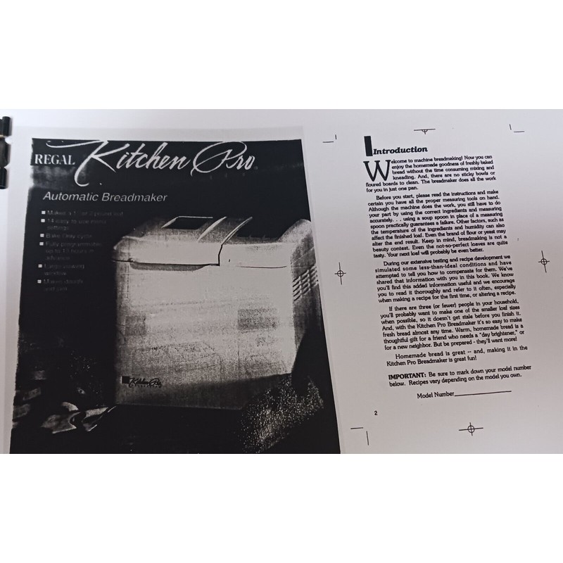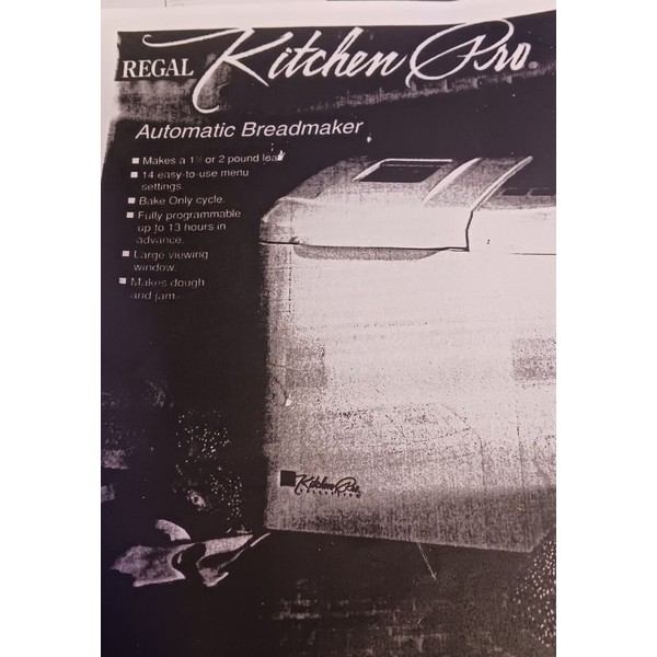 This is a printed loose copy of the REGAL Kitchen Pro automatic Breadmaker Machine owners manual. includes recipes, parts list and complete instructions. Unbound. Printed from my home printer. In English language.