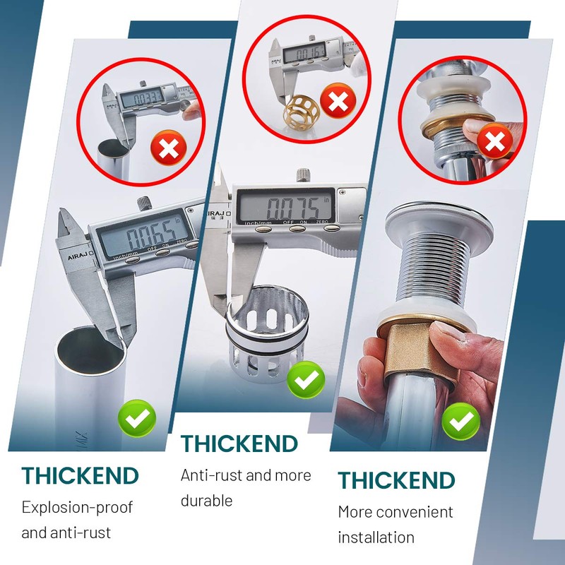 ❹EASY INSTALLATION-Anyone can install a pop up drain due to its simple construction,no tools required, the thickened and extended nut allow it to be mounted by bare hand.Fits standard american bathroom sink with 1-1/2" to 1-3/4 inch drain hole(1.45 to1.96 inches).