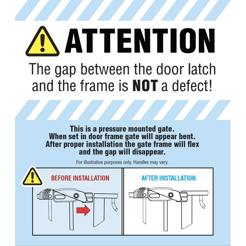- EASY TO USE AND SET UP: Pressure mount design that is quick to set up. Please note, before installation there will be a gap between the gate latch and the frame which is NOT a defect and it is NOT bent. This gap will be eliminated once installed
