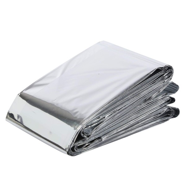 Emergency reflective blanket- an essential piece of equipment for hiking, biking and cross-country trips. Showerproof windproof and highly reflective, this simple piece of kit can be wrapped around the body to maintain core temperature during emergency waits outdoors.
