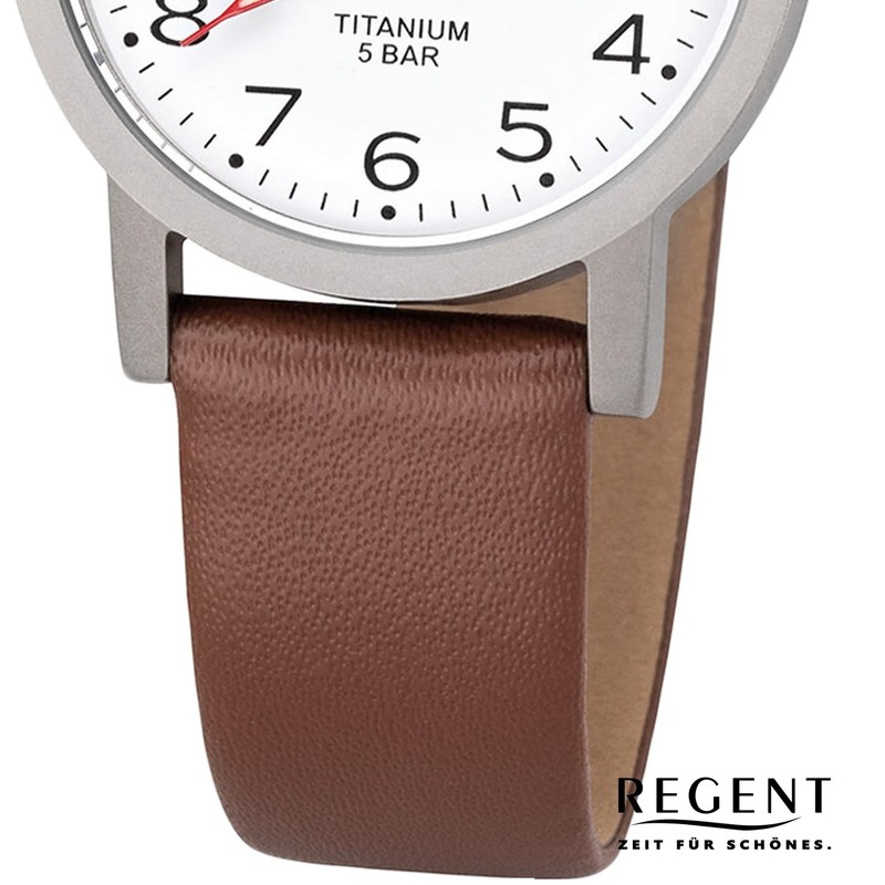 - White dial, black-red hands, mineral glass, pin buckle, Regent logo