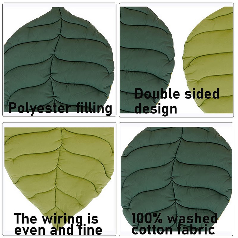 ●Reversible & Cloud-Like Comfort – Soft surface on both sides offers plush warmth or playful charm, mimicking the cozy feel of Squishmallow pet beds. Perfect for pets who love to burrow or switch textures! ●Non-Slip & Easy Clean – Durable grip bottom keeps the mat in place on hardwood or tile floors, while the washable fabric resists pet hair and odors. Just toss it in the machine after playtime! ●All-Season Coziness – PP cotton filling adapts to temperatures—snug in winter, breathable in summer. Ideal for indoor cats or small dogs who crave a temperature-regulated nap spot. ●Leaf-Shaped Beauty – Unique nature-inspired design adds a whimsical touch to your home decor, blending seamlessly with plant lovers’aesthetics. It perfectly matches various styles of home decoration ●Portable & Multi-Use – Foldable with a carry strap for trips. Use in crates, carriers, or sofas—great for apartments, camping, or vet visits. ●Anxiety Relief – Soft texture and enclosed shape help pets feel secure, reducing stress for anxious fur babies. Usage Scenarios