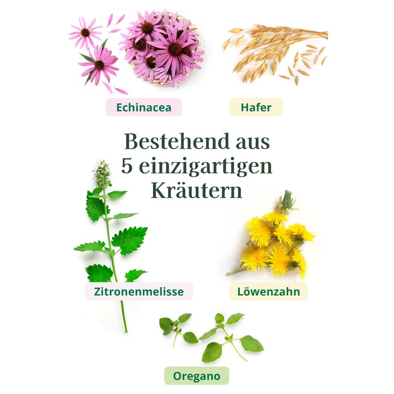 - For immune system & respiratory tract: contains active botanicals, lactic acid bacteria and echinacea - one of the best documented and recognised herbs for immune support and soothing the throat and throat. Oregano supports normally functioning respiratory tract.