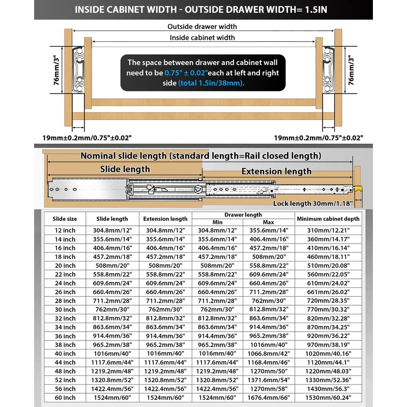 - 【Installation notes】 Choose the size of the rails according to the depth of the drawer. The length of drawer≥length of slides,the tolerance 0.7in/20mm-1in/30mm is okay. The space between drawer and cabinet wall need to be 19mm/0.75in each side(total 38mm/1.5in). Attention: one set includes a pair of slides without any screws(The type M5 screws can be applicable,you can buy different M5 screws according your specific application scenarios). contact us without hesitate if any installing problem.