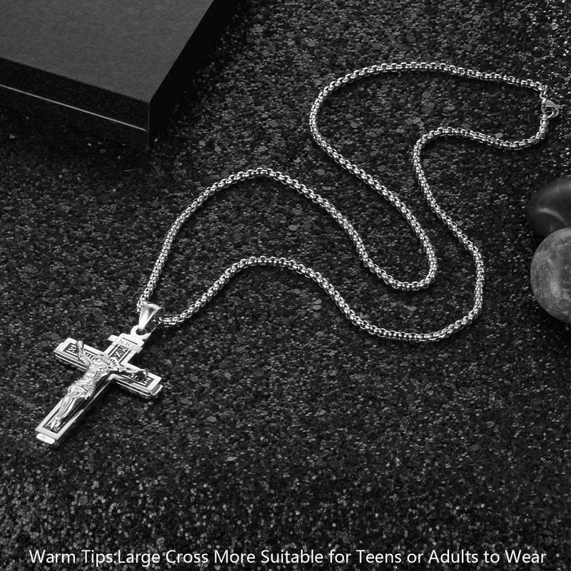 - Pendant Size:Length:2.17 Inch;Width:1.37 Inch ;Chain Size:Length:24 Inch;Colour:Silver;Large Cross More Suitable for Teens or Adults to Wear