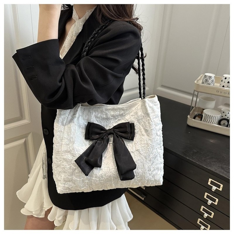 - Design and Silhouette: This tote bag has a feminine design with a large ribbon. The textured 3D fabric with an elegant luster adds glamour. The slightly trapezoidal silhouette goes well with both neat and casual. The simple yet present, design is the perfect accent for your outfit