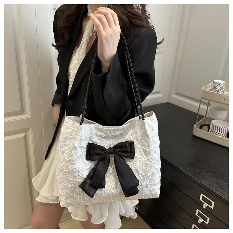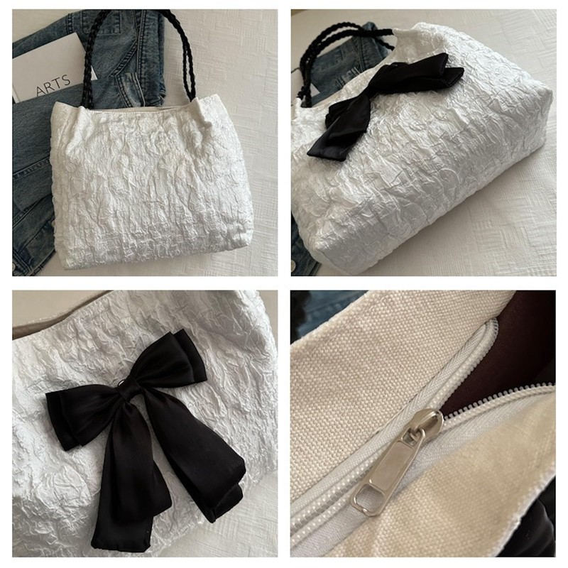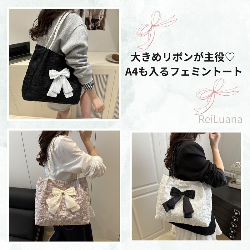 - Details: It is large enough to fit A4 size items. It is also very practical. The gusset allows you to securely store pouches, notebooks, folding umbrellas, etc. The long woven handle that can be worn over the shoulder is both cute and functional. There is a zipper on the top, so it is designed to prevent theft and contents from being seen. The center of the bag has a large ribbon to make it the main part of your outfit