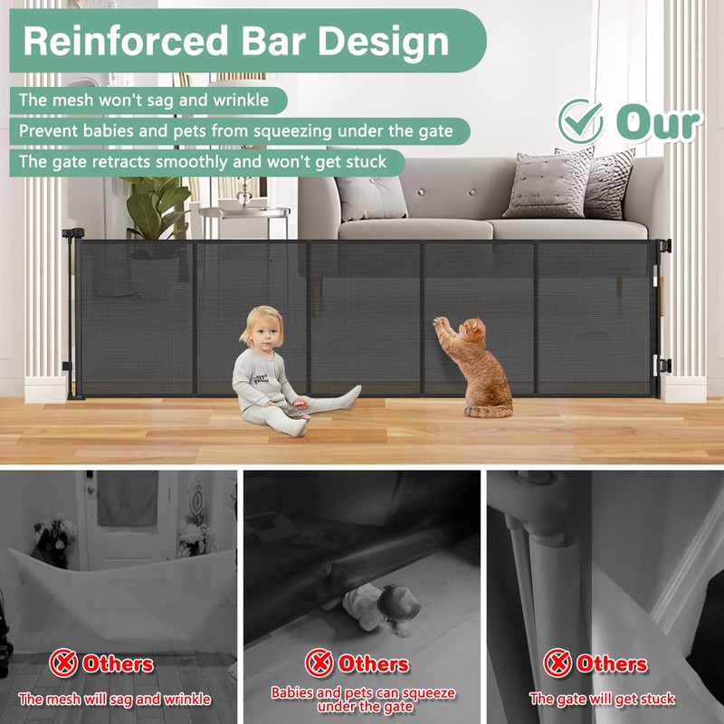 - Reinforced Bar Design : the mesh has built-in reinforcement strips.1. The mesh won't sag and wrinkle.2. There is no gap between the mesh gate and the floor, and it can't be lifted up underneath the mesh baby gate.3. The mesh dog gate retracts smoothly and won't get stuck.