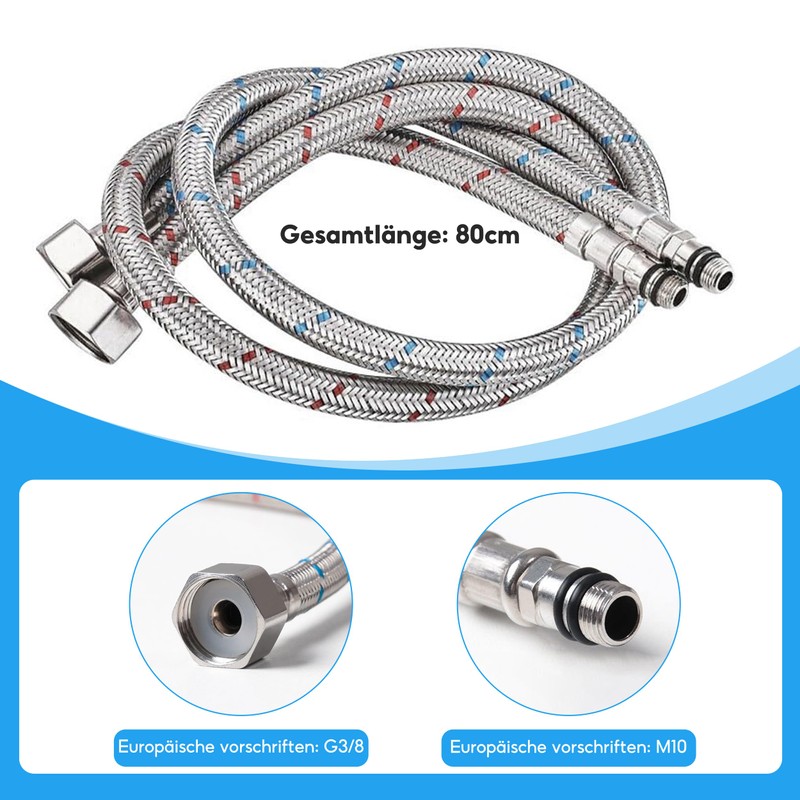 - With a length of 80 cm and the high-quality braided stainless steel coating, these flexible hoses not only offer high resistance, but also excellent flexibility and durability.