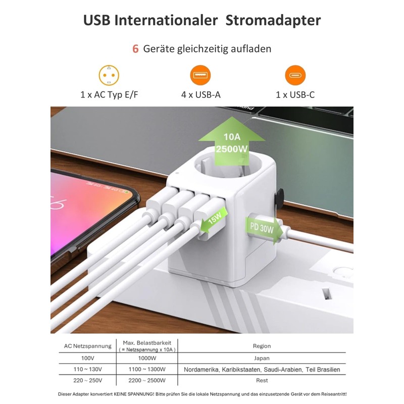 - Leistungsstarke Ladetechnologie: Der 30W PD Typ-C Anschluss und die 4 USB-Ports ermöglichen blitzschnelles Laden für eine Vielzahl von Geräten, darunter iPhones, Samsung-Geräte, Google-Produkte, Laptops, MacBook Air, iPad Pro und mehr. Er Konvertiert KEINE SPANNUNG! Bitte überprüfen Sie die lokale Netzspannung vor dem Reiseantritt.