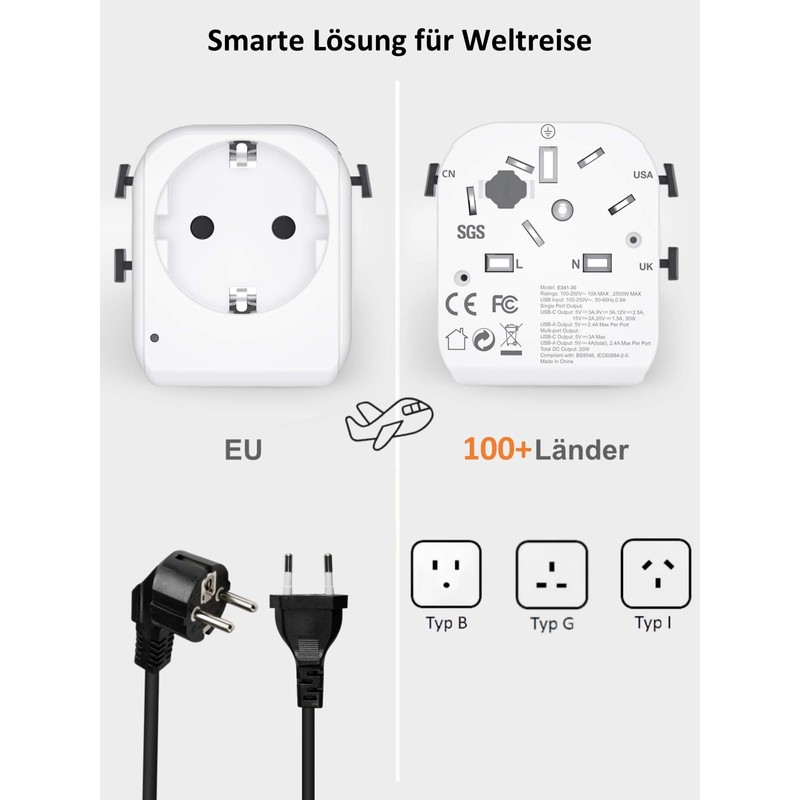 Reiseadapter Schuko 3-Pin Universal 4 x USB A, 1 x USB C 30W und 1 x AC, Internationaler Steckdosenadapter, Universaladapter Deutschland auf USA England, Australien, China + 1m C-C Nylon Ladekabel