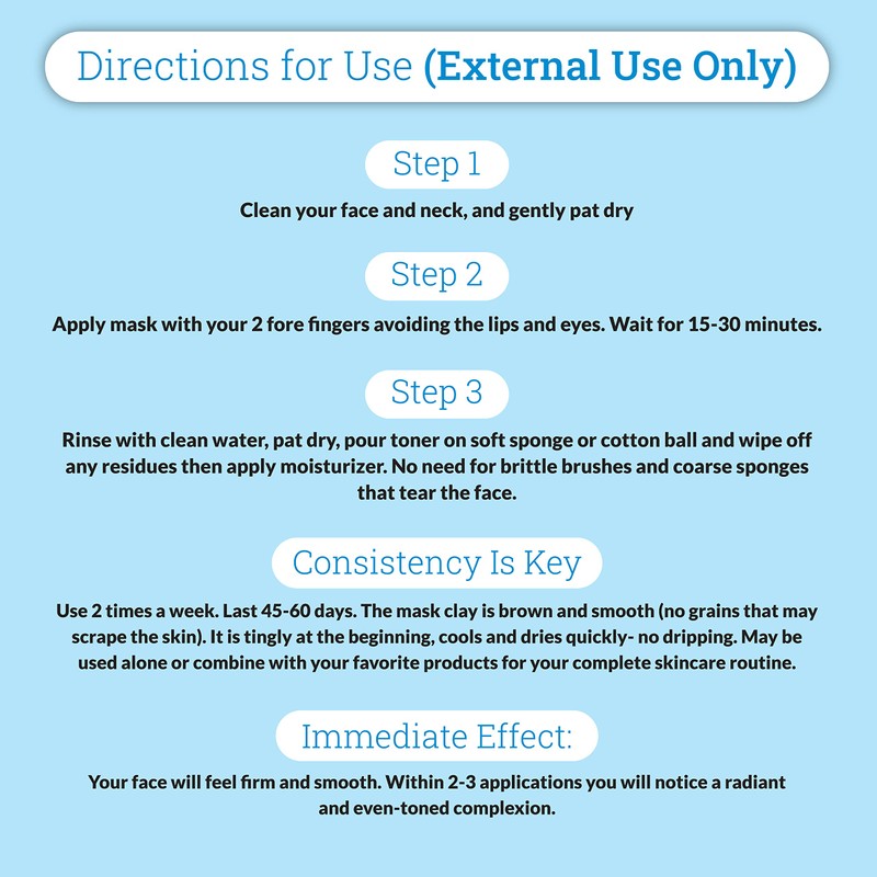 - CONSISTENCY IS KEY-Repeat 2 times a week. Last 45-60 days. The masque clay is brown and smooth (no grains that may scrape the skin). It is tingly at the beginning, cools and dries quickly so there is no dripping. Use it alone or combined with other products of your choice for a complete skin care routine. Not for sensitive skin