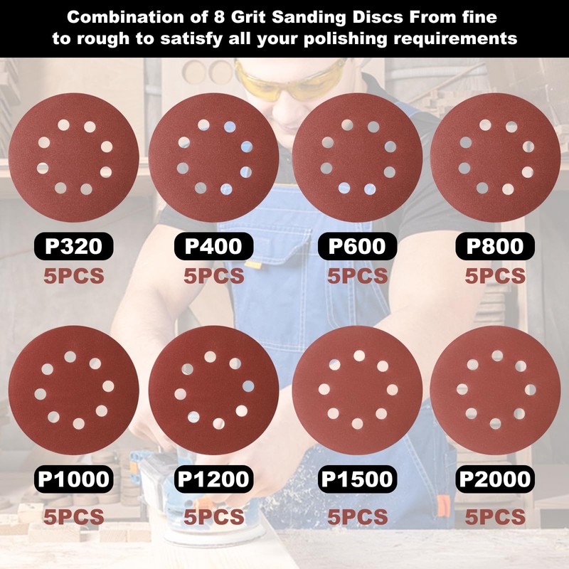 - 【Multi-grit sanding discs】: you will receive 40 pieces, 8 different types of sandpaper, sandpaper from fine to coarse, p2000/p1500/p1200/p1000/p800/p600/p400/p320, (8 models, the larger the number, the finer it) offer you more choice when you 125 mm diameter 8-holes mixed grit, suitable for all 5 inch sanders.