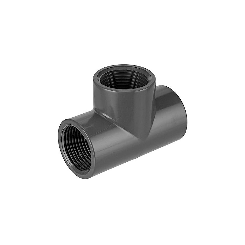 PVC T-piece 90° with three equal internal threads. The PVC-U T-piece 90° with three equal size Whitworth female threads. PVC-U fittings can be screwed into the 90° PVC-U T-piece. To seal the thread, we recommend Teflon sealing material.