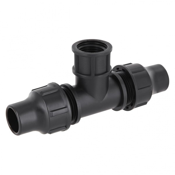 The T-piece with 2-way lock system connection is suitable for PE pipes in the selected diameter. The internal thread is suitable for threaded fittings of the same inch size. The fitting can be loaded up to a pressure level of maximum 4 bar.