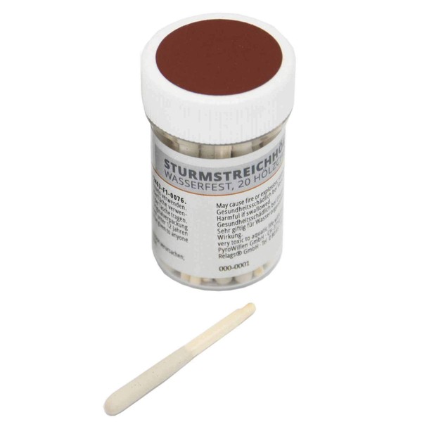 Sturmstreichhölzer in Dose In dieser kleinen Plastikdose mit Schraubverschluss und Reibfläche (auf dem Deckel), sind die Hölzer spritzwassergeschützt und sicher untergebracht Die Sturmstreichhölzer haben einen langen Schwefelkopf und brennen deshalb auch bei stärkerem Wind Die Schutzschicht über dem Hölzchen macht diese wasserfest Maße: 32 x 53 mm Gewicht: 15 g 20 Hölzchen