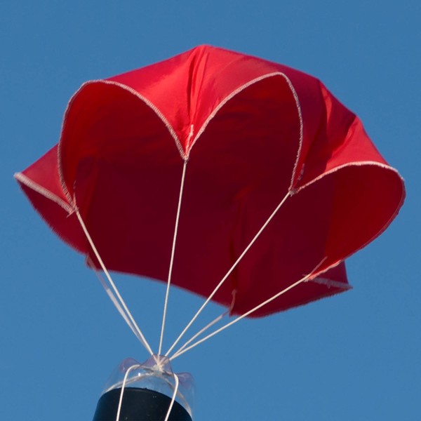 - 24" red Rip-stop nylon parachute with 6 sides and 6 braided nylon shroud lines.