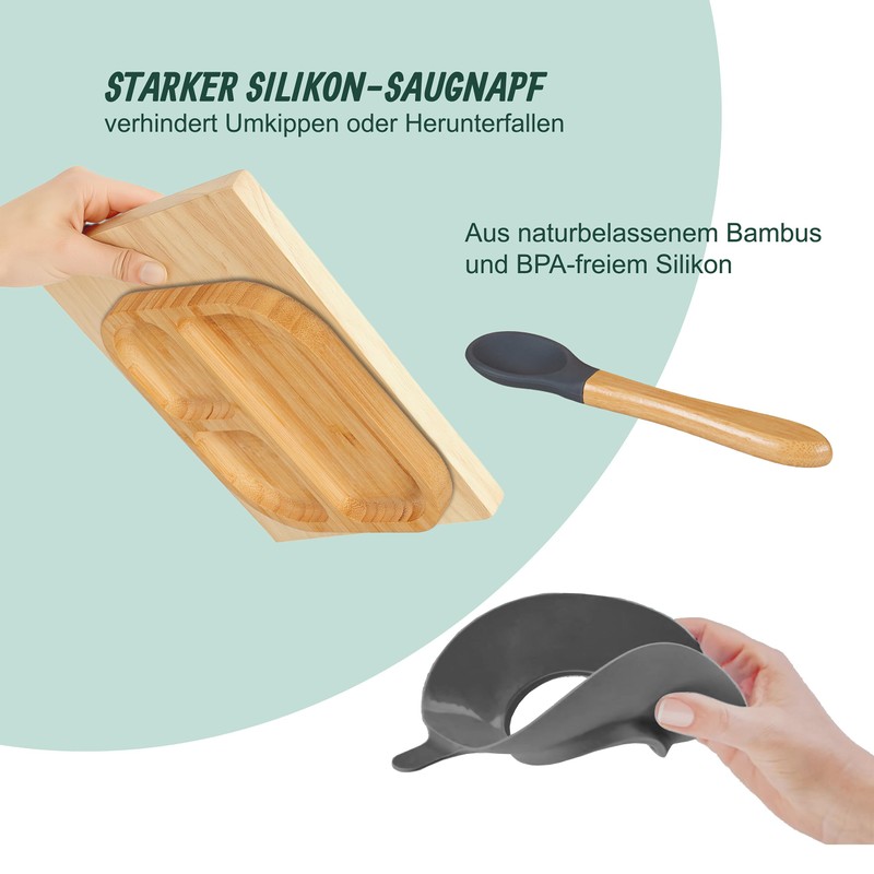- Safe: worry-free snacking with the BPA-free baby tableware - made of bamboo and grey silicone