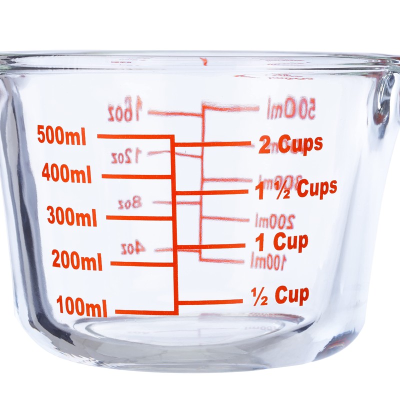 - Mit Skala: Glasmessbecher mit 3 Maßeinheiten - Rote Skala in Milliliter, oz und amerikanischen Cups