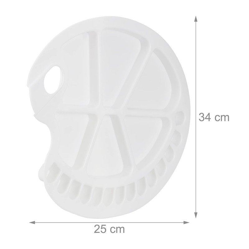 - Details: plastic painting palette H x W x D: approx. 1.5 x 34 x 25 cm. Finger hole W x D: approx. 3.5 x 2.5 cm