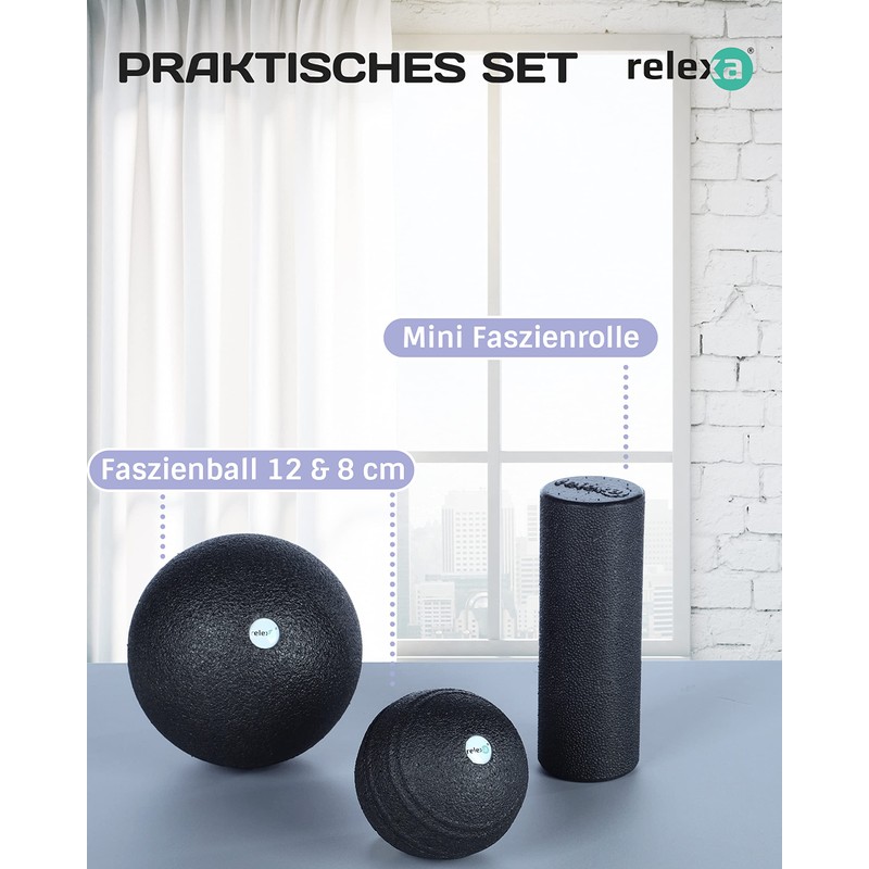 - Practical set: with the 3-piece set consisting of 1 mini fascia roller (5.2 x 15 cm), 1 fascia ball (12 cm), 1 fascia ball (8 cm) and 1 storage bag, you can vary your fascia massage ideally