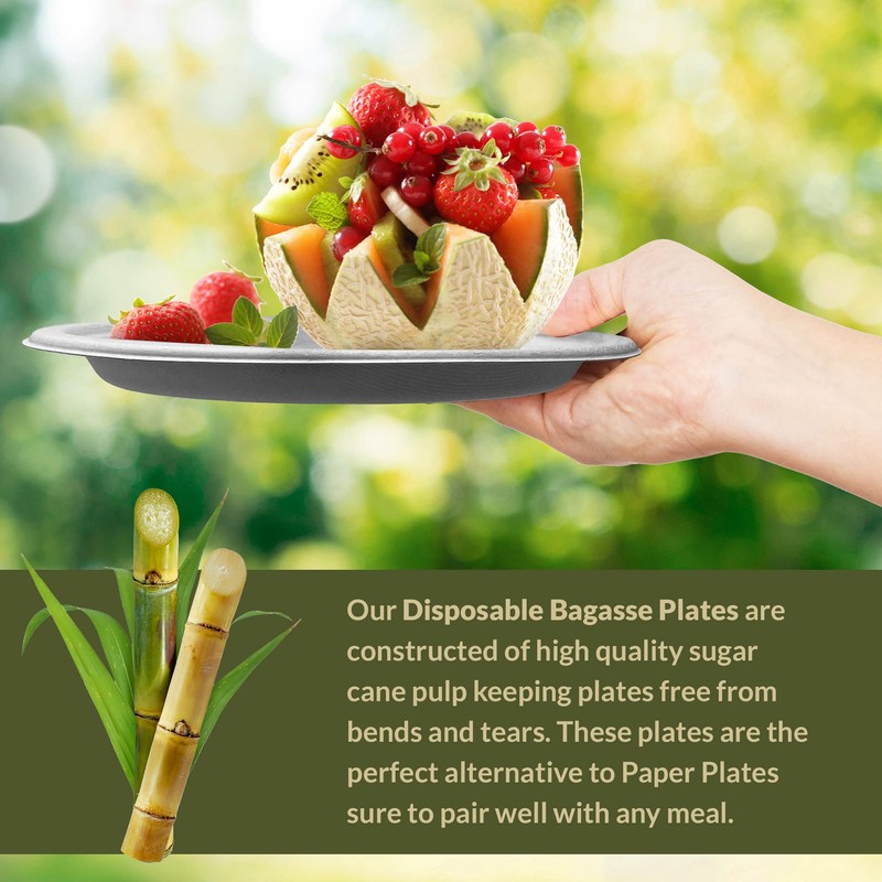 - Eco Friendly: Our round disposable plates are made of commercially compostable/biodegradable sugar cane fibers.