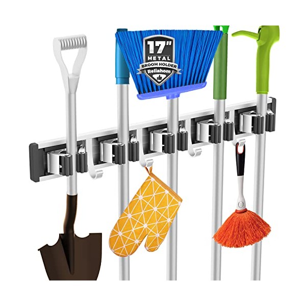 - ✔Sturdy & Durable: Reliahom broom holder is made of metal base board, Stainless steel grip, metal Hooks. It is strong, waterproof, durable.