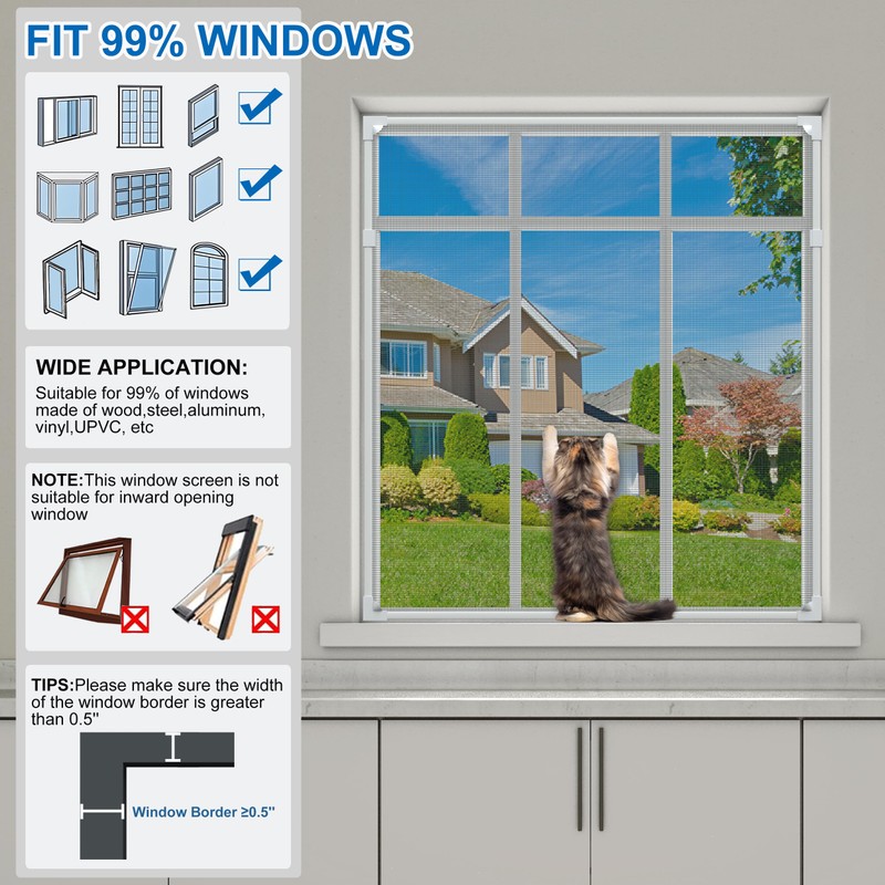 - Kids & Pet Friendly Window Screen:Our window mesh partition is friendly for families with kids and pets,like cats,dogs,and birds,to deter them from going outside,while save you from outside disgusting creatures entering the room,like pesky insects,flies,leaves,debris,dust and dirt.Suitable for 99% of windows made of wood,steel,aluminum,vinyl,such as sliding window,casement window,single or double-hung window,top-hung window,side -hung window,European window,shutters,skylights,roof window