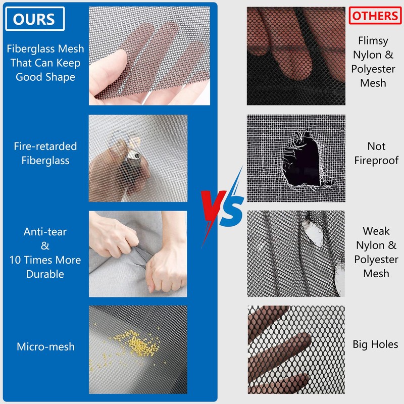 - Upgraded Fiberglass:Fiberglass mesh is one of the most commonly used material for high-end window net screen series,with the advantages of wear and tear resistance and excellent corrosion resistance for all weather conditions!It is 10 times more sturdy and durable than nylon or polyester mesh,which is molded by high temperature so that can keep good shape,not easy to deform,wrinkle,crease or dent,when cutting,the fiberglass screen net will not unravel,no loose threads or edges coming undone