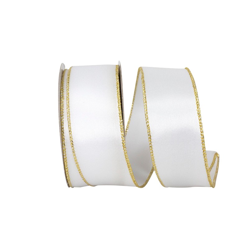 - Ribbon Satin Value Metallic Wired Edge, White/gold ; This wired edge ribbon has metallic stitching on the edges to make it appropriate for your seasonal designs. It has a medium finish so that the ribbon body stands up very well. It is also one of the best values in our line.