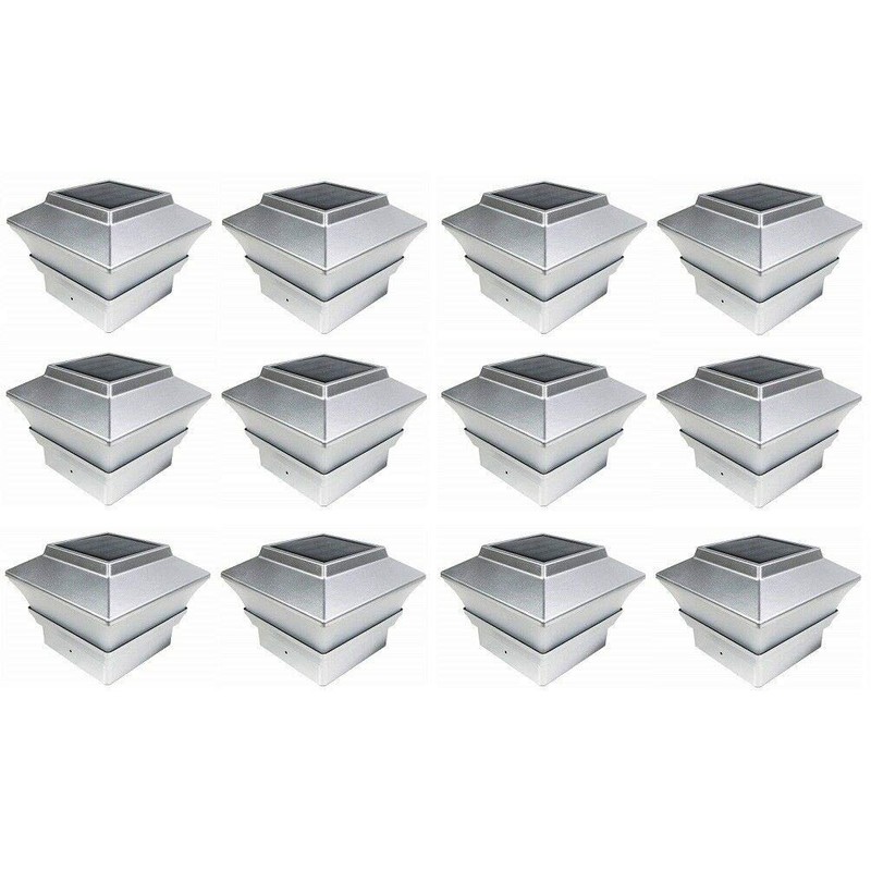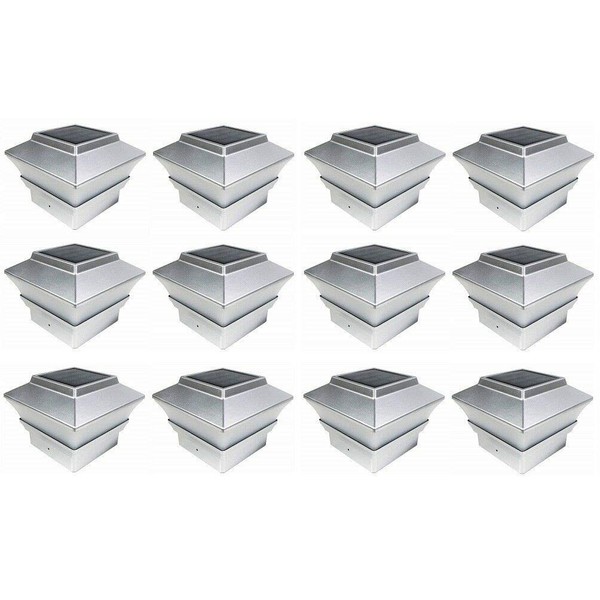 RELIGHTABLE (12 Pack) 4" x 4" Solar Power Square Outdoor Post Cap Lights for PVC Vinyl (Silver)