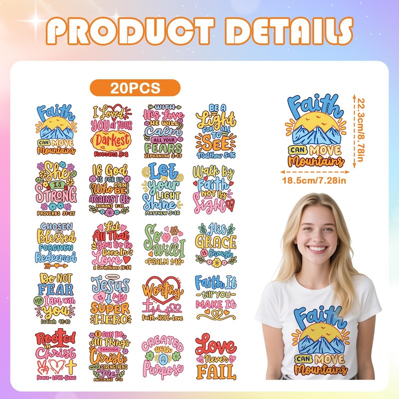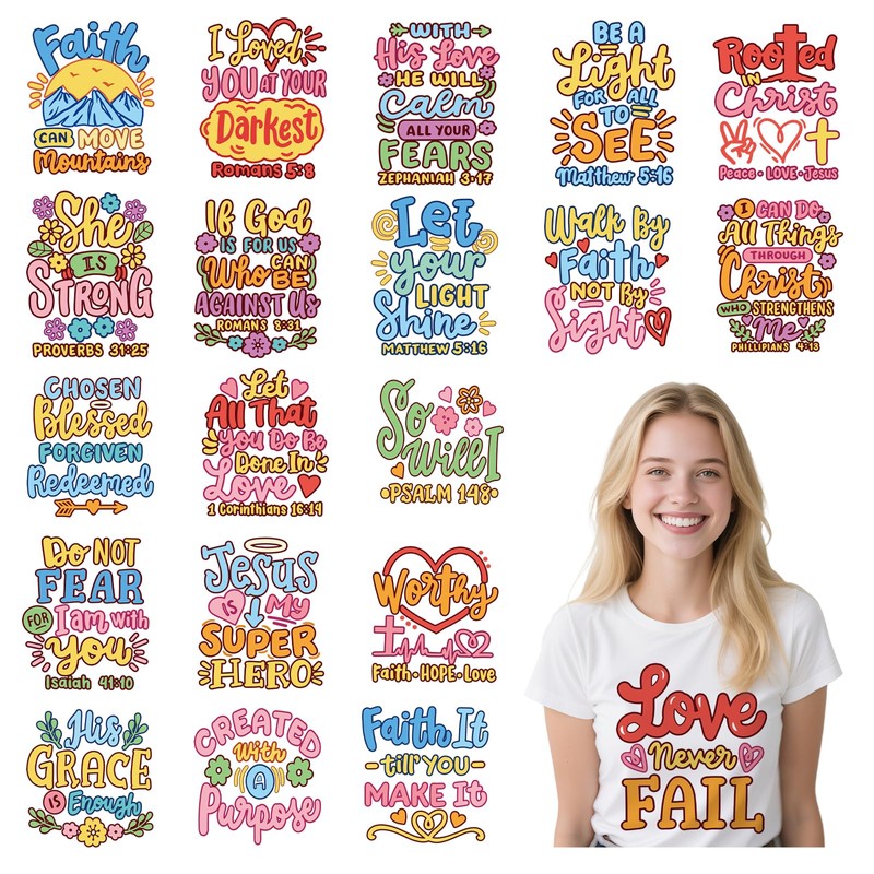 - Enjoy DIY creation party and with 20 ready-to-press transfer sheets featuring Christian Bible verse style patterns, providing diverse styles in bulk quantities. Ideal for decorating, gifting, or refreshing apparel