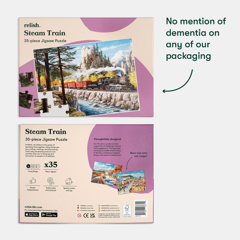 - DEMENTIA FRIENDLY - Relish large piece jigsaw puzzles have been specifically designed to provide just the right balance of challenge, interest and engagement for anyone, ranging from the elderly, seniors, visually impaired and Dementia and Alzheimer’s patients.